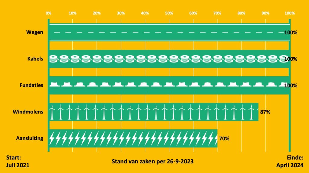 Van het totaal aantal windturbines voor Windplan Groen is inmiddels 87% gebouwd. De bouw is mede afhankelijk van de weersomstandigheden en vordert goed als er weinig wind is. Naar verwachting wordt de bouw begin 2024 geheel afgerond.