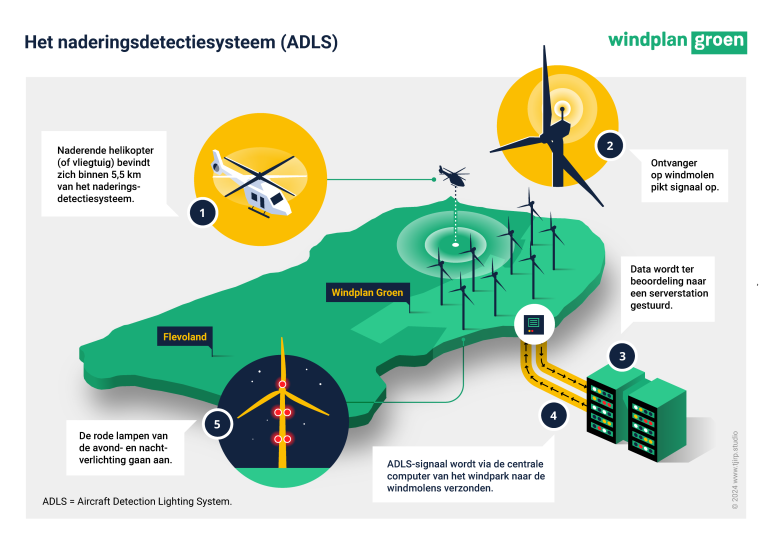 Het systeem van Windplan Groen werkt met antennes op 7 windturbines verdeeld over het windpark. Deze antennes vangen de signalen op van transponders, die standaard in vliegtuigen zitten. De antennes geven de data van deze signalen door aan een serverstation, dat razendsnel bepaalt waar de vliegtuigen zich bevinden. Als blijkt dat een vliegtuig dicht in de buurt van Windplan Groen komt, stuurt de server een signaal naar de centrale computer van het windpark, die op z’n beurt in een fractie van een seconde de rode lampen inschakelt op de windturbines. Dit hele proces is inzichtelijk gemaakt in dit beeldverhaal.
